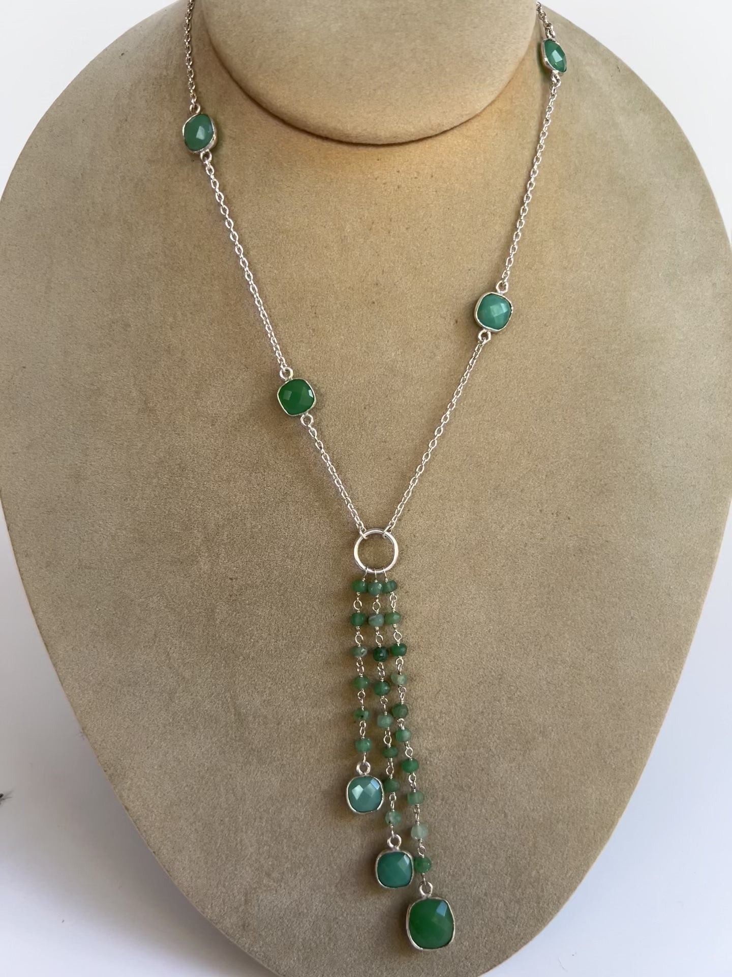 Green onyx necklace. Oval stones on sterling chain. Restfulness. Sterling silver. 20 - 22" adjustable chain.