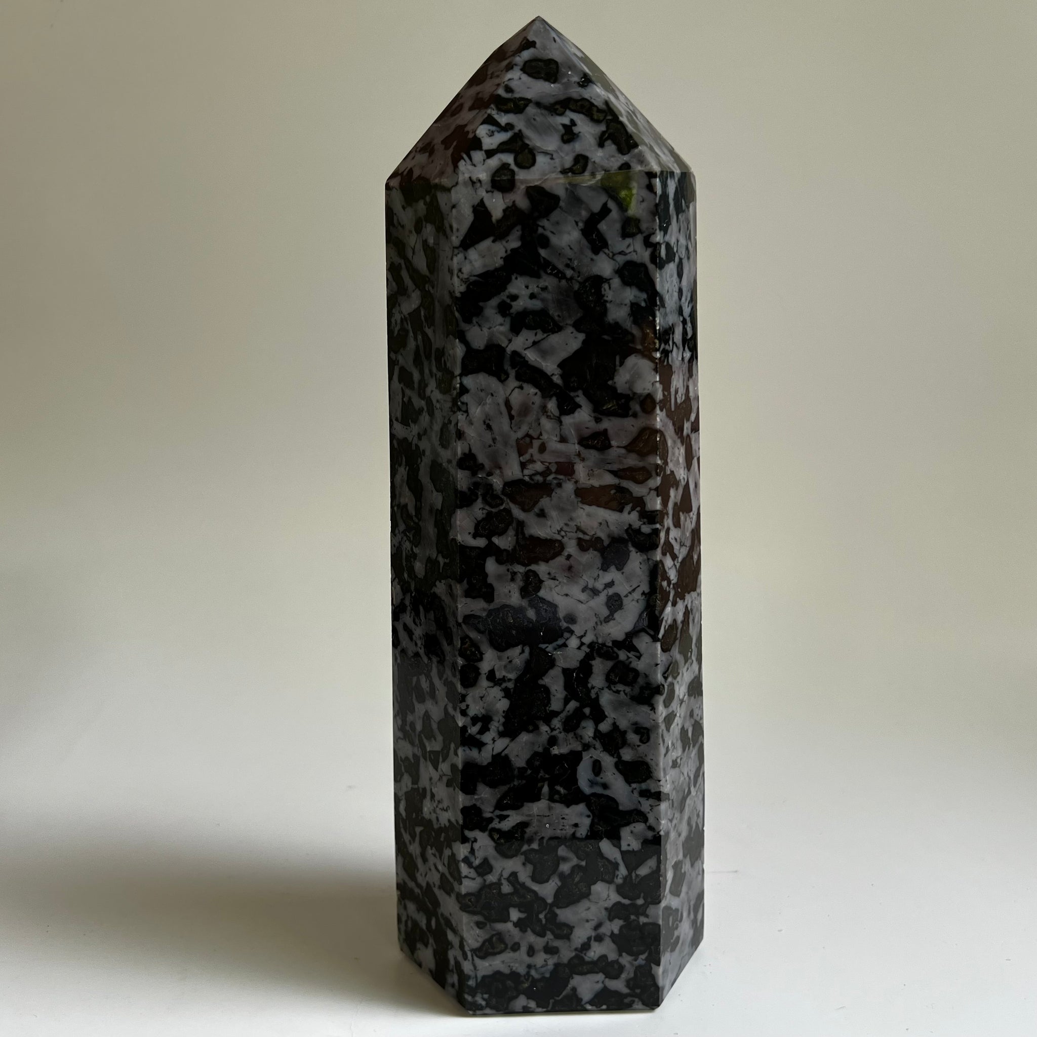 Polished Merlinite 6-sided tower. Large specimen.  Also known as Indigo Gabbro, this is the magician's stone, aiding in spellcasting and developing one's intuition. (Madagascar)   11.5" x 4.5" x 3.5"