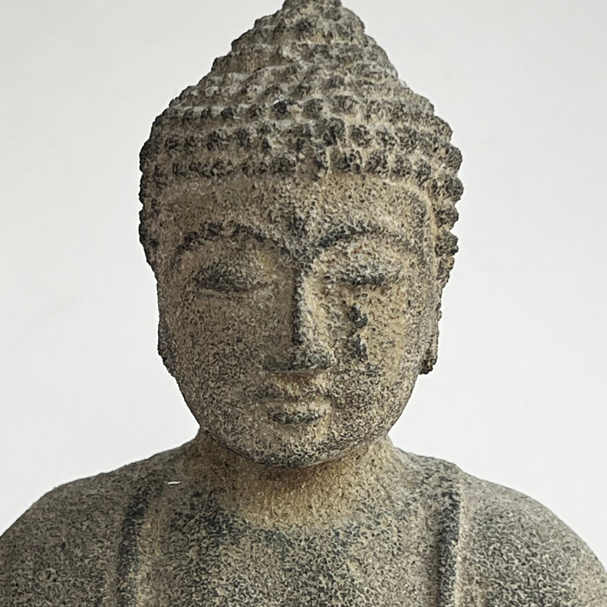 Meditating buddha. A splendid presence in either home or garden. Grey stone. (Bali) 6.5" x 5" x 3"